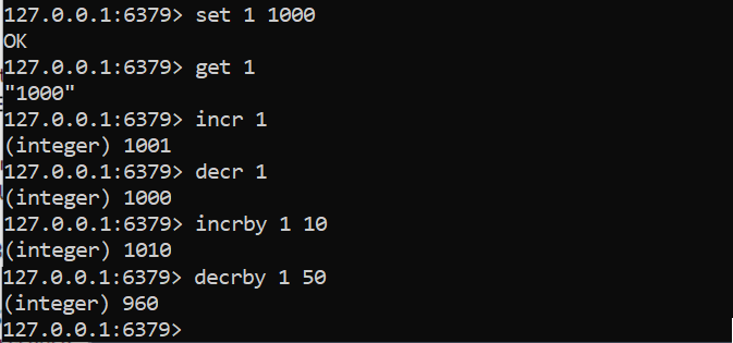 incrby key ex) incr 1 ex) decr 1 ex) incrby 1 10 ex) decrby 1 50 |