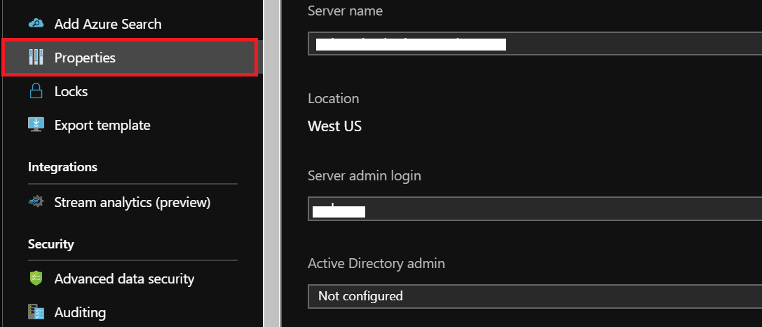 관리자로 작동하는 계정에는 두 가지가 (서버 관리자 및 Active Directory 관리자)이 있습니다. SQL 서버에 대해 이러한 관리자 계정을 식별하려면 Azure Portal을 열고 SQL Server 또는 SQL Database의 [속성] 탭으로 이동한다.