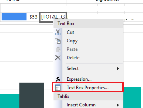 폰트의 컬러 속성을 지정하기 위해서, 값을 표시하려는 표의 컬럼에서 마우스 오른쪽 버튼을 클릭하여 [Text Box Property] 항목을 선택 한다.