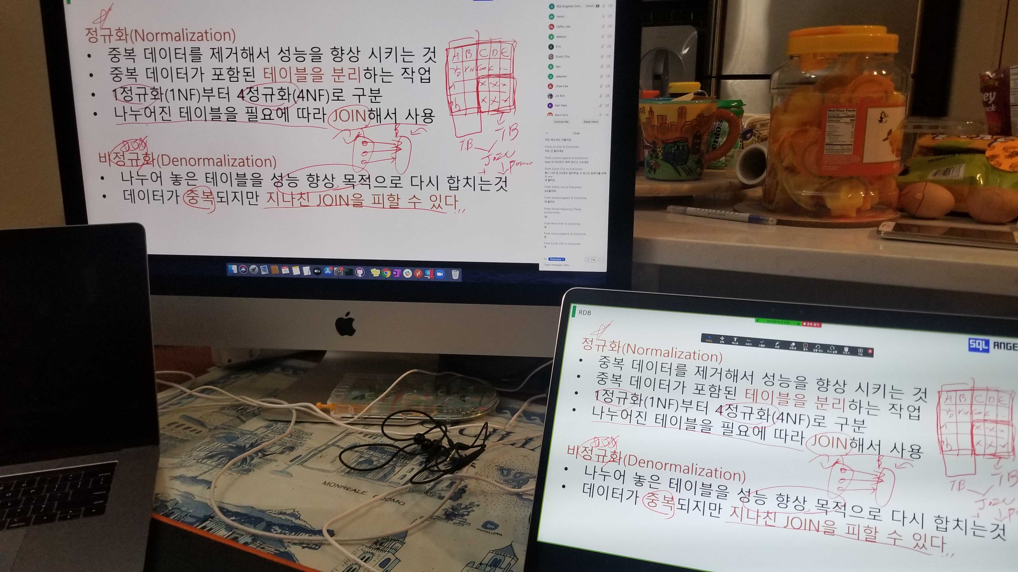 발표자료는 파워포인트로 슬라이드를 만들고, 온라인 강의는 ZOOM이라는 솔루션을 하였습니다. SQL Angeles에서는 최대 100명까지 온라인 스터디에 참여할 수 있는 유료 솔루션을 보유하고 있으며, 다양한 강좌를 온라인으로 운영하고 있습니다. 발표 슬라이드에서 중요한 부분이나 추가 설명을 해야 하는 부분은 노트 기능을 이용하여 그림을 그려가면서 설명하였습니다.