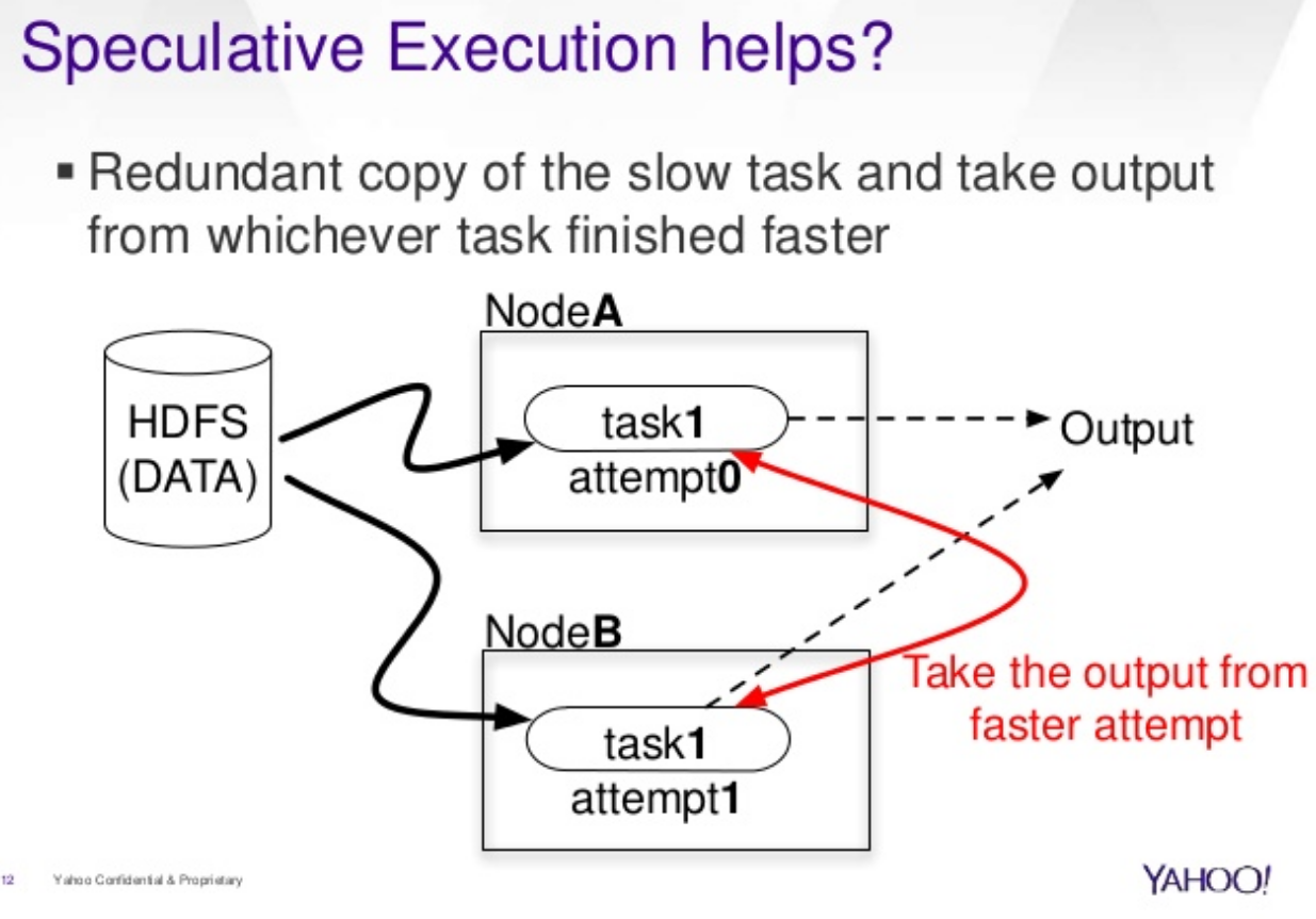 즉, 동일한 태스크를 여러노드에서 실행함으로써, 특정 노드가 느리더라도 (장비 노후 또는 기타 문제로) 다른 노드에서 먼저 끝나면 해당 결과를 사용하고 나머지 노드는 중지 시킨다. 그래서 전체적으로는 수행시간이 단축된다.
