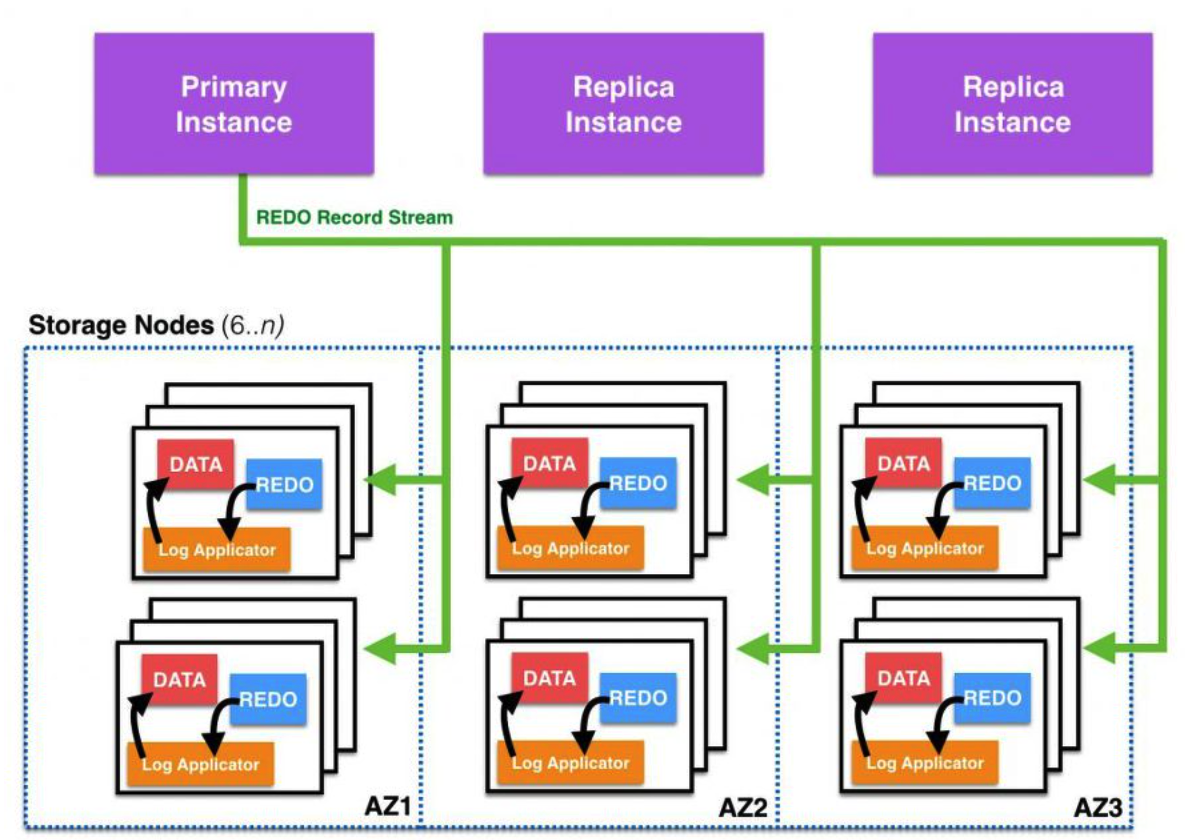 Amazon Aurora 스토리지 엔진은 한 지역의 여러 AWS 가용 영역(AZ)에 걸쳐 있는 분산 SAN 이다. AZ는 물리적 데이터센터로 구성된 논리적 데이터센터 이다. 각 AZ는 해당 지역의 다른 AZ와 빠른 통신을 허용하는 짧은 지연 시간 링크를 제외하고 다른 AZ와 격리되어 있다. Amazon Aurora의 중심에 있는 분산형 저지연 스토리지 엔진은 AZ에 의존한다.