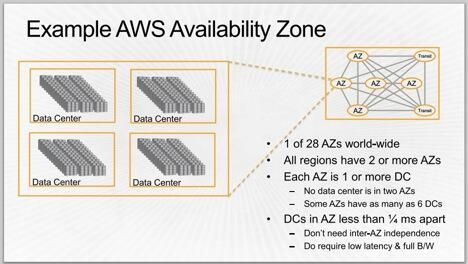 AZ(가용 영역)는 AWS 리전의 이중화 전력, 네트워킹 및 연결이 제공되는 하나 이상의 개별 데이터 센터로 구성된다. AWS 리전의 모든 AZ는 높은 대역폭, 지연 시간이 짧은 네트워킹, 완전한 이중화를 갖춘 전용 메트로 광 네트워크와 상호 연결되어 있어 AZ 간에 높은 처리량과 지연 시간이 짧은 네트워킹을 제공한다. 네트워크 성능은 AZ 간 동기 복제 기능을 충분히 수행할 수 있으며 AZ 간의 모든 트래픽은 암호화된다. AZ는 다른 모든 AZ와 수 킬로미터에 상당하는 유의미한 거리를 두고 물리적으로 분리되어 있다. 다만 모든 AZ는 서로 100km(60마일) 이내의 거리에 위치한다.