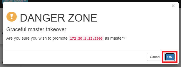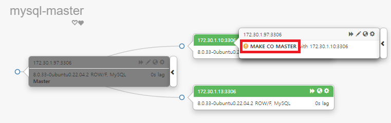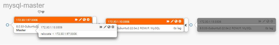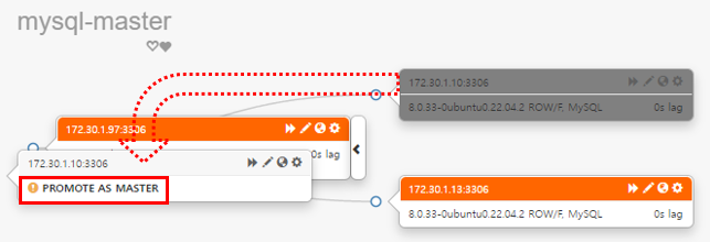 mysql-slave1(172.30.1.10)을 드래그 하여 mysql-master(172.30.1.97)로 드롭 한다. 이때 드롭하는 위치를 현재 마스터보다 조금 앞으로 위치하여 PROMOTE AS MASTER가 표시될 때 드롭 한다. (마스터 보다 뒤에 할 경우 relocate로 표시된다.)