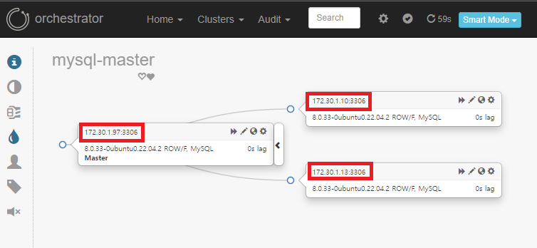 오케스트레이터 대시보드에 접속하면 현재 구성되어 있는 클러스터 목록을 볼 수 있다. 여기에서 숫자 3과 1이 보이는데, 3은 현재 구성된 클러스터의 전체 서버 개수이며, 2는 슬레이브 서버 개수이다.