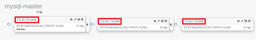 시나리오를 처음 상태로 원상복구하려면 mysql-slave2(172.30.1.13)를 드래그하여 mysql-master(172.30.1.97)에 드롭 한다.