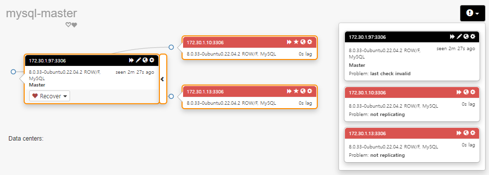 해당 클러스터를 클릭해서 상세 대시보드를 살펴보면, 현재 mysql-master(172.30.1.97) 서버가 응답 없음을 나타내고 있으며, 슬레이브는 복제가 되지 않는 것을 확인할 수 있다. 우측의 느낌표를 클릭하면 각 노드의 에러 메시지를 상세하게 확인할 수 있다.