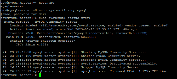 자동 장애조치 테스트를 위해 현재 master로 운영중인 서버의 MySQL을 강제로 중지한다.