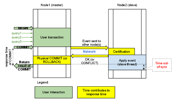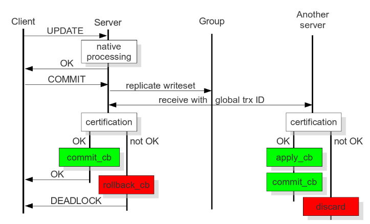 6. 인증 테스트에 실패하면 노드는 쓰기 세트를 삭제하고 클러스터는 원래 트랜잭션을 롤백한다. 그러나 테스트가 성공하면 트랜잭션이 커밋되고 쓰기 세트가 클러스터의 나머지 부분에 적용된다.