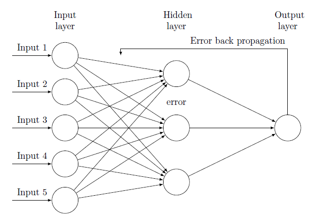 다층 퍼셉트론(Multi-layer Perceptron, MLP)으로 학습 한다는 것은 최종 출력값과 실제값의 오차가 최소화 되도록 가중치와 바이어스를 계산하여 결정하는 것이다. 순전파 (Feedforward) 알고리즘 에서 발생한 오차를 줄이기 위해 새로운 가중치를 업데이트하고, 새로운 가중치로 다시 학습하는 과정을 역전파 (Backpropagation) 알고리즘 이라고 한다. 이러한 역전파 학습을 오차가0에 가까워 질 때까지 반복한다. 역전파 알고리즘을 실행할때 가중치를 결정하는 방법에서는 경사하강법이 사용된다.