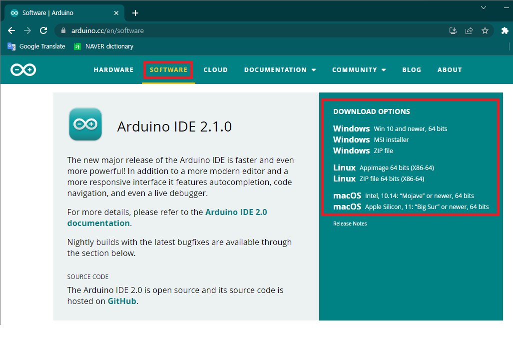 Arduino IDE를 다운받기 위해서 아래 주소로 접속하여 OS에 맞는 설치 버전을 선택한다.