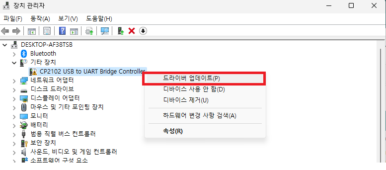 다운로드 받은 경로로 드라이버 업데이트를 진행한 다음, 정상적으로 설치가 되면 아래와 같이 포트 번호를 확인할 수 있다.