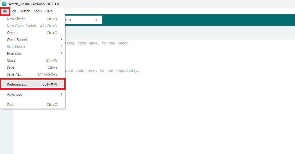 지금까지는 Arduino IDE 툴만 설치된 상태이다. ESP32보드를 연결하려 해당 보드에 대한 드라이버를 설치해야 한다. [파일] – [환경설정]을 클릭한다.