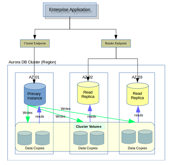 Amazon Aurora DB Cluster는 하나 이상의 DB 인스턴스와 이 DB 인스턴스의 데이터를 관리하는 클러스터 볼륨으로 구성된다. Aurora 클러스터 볼륨은 다중 가용 영역을 아우르는 가상 데이터베이스 스토리지 볼륨으로 각 가용 영역에는 DB 클러스터 데이터의 사본이 있다.