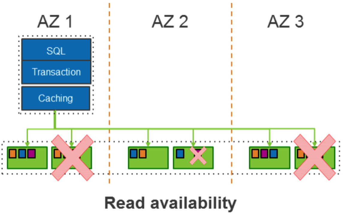 이 설계를 통해 Amazon Aurora는 클라이언트 애플리케이션에 대한 가용성 영향 없이 전체 AZ 또는 2개의 스토리지 노드 손실을 견딜 수 있다.