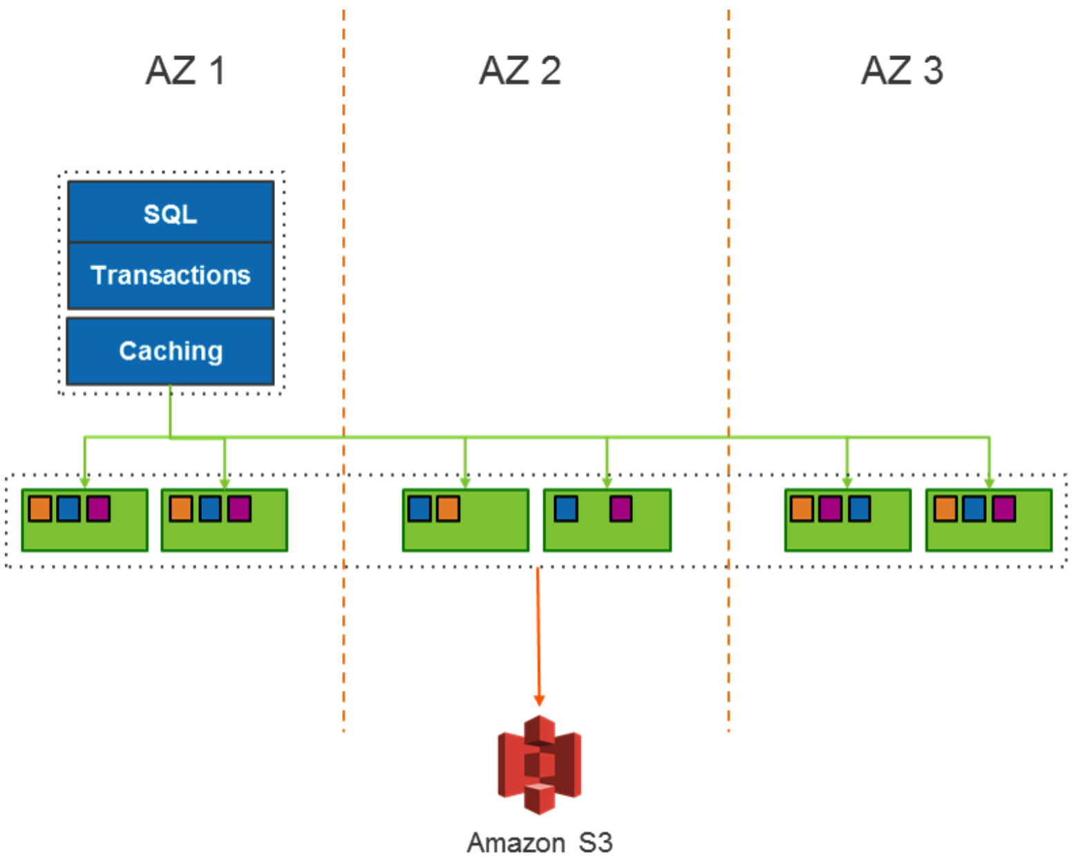 아래 다이어그램은 3개의 AZ에 저장된 데이터를 보여준다 복제된 데이터는 99.999999999%의 내구성을 제공하도록 설계된 S3에 지속적으로 백업 된다.