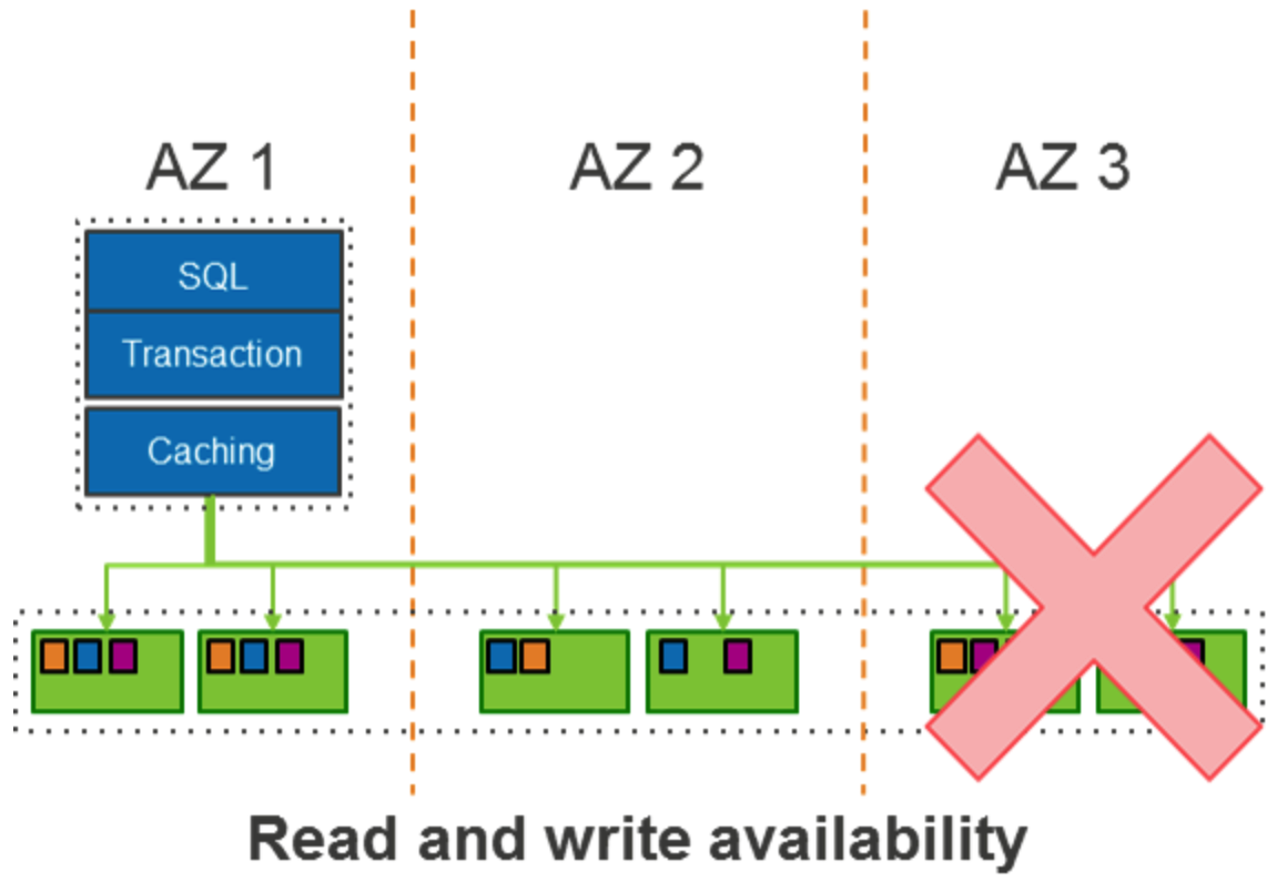 이 설계를 통해 Amazon Aurora는 클라이언트 애플리케이션에 대한 가용성 영향 없이 전체 AZ 또는 2개의 스토리지 노드 손실을 견딜 수 있다.