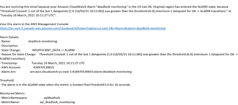 l Monitor deadlocks in Amazon RDS for SQL Server and set notifications using Amazon CloudWatch : https://aws.amazon.com/blogs/database/monitor-deadlocks-in-amazon-rds-for-sql-server-and-set-notifications-using-amazon-cloudwatch/