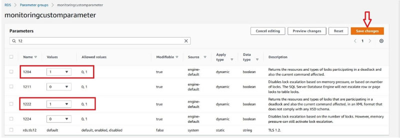 데드락 모니터링을 활성화 하기 위해서는 파라메터 그룹에서 데드락 이벤트인 1204, 1222를 선택하고 값을 1로 설정한다. 파라메터 그룹 수정 후 적용을 위해서는 RDS 인스턴스를 재시작 해야 한다.