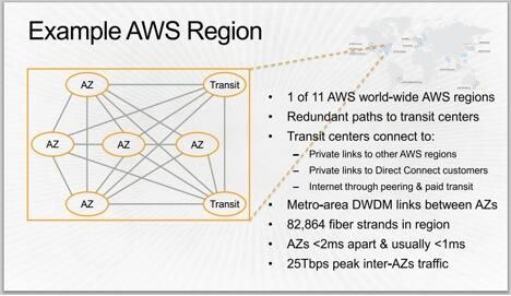 AZ(가용 영역)는 AWS 리전의 이중화 전력, 네트워킹 및 연결이 제공되는 하나 이상의 개별 데이터 센터로 구성된다. AWS 리전의 모든 AZ는 높은 대역폭, 지연 시간이 짧은 네트워킹, 완전한 이중화를 갖춘 전용 메트로 광 네트워크와 상호 연결되어 있어 AZ 간에 높은 처리량과 지연 시간이 짧은 네트워킹을 제공한다. 네트워크 성능은 AZ 간 동기 복제 기능을 충분히 수행할 수 있으며 AZ 간의 모든 트래픽은 암호화된다. AZ는 다른 모든 AZ와 수 킬로미터에 상당하는 유의미한 거리를 두고 물리적으로 분리되어 있다. 다만 모든 AZ는 서로 100km(60마일) 이내의 거리에 위치한다.