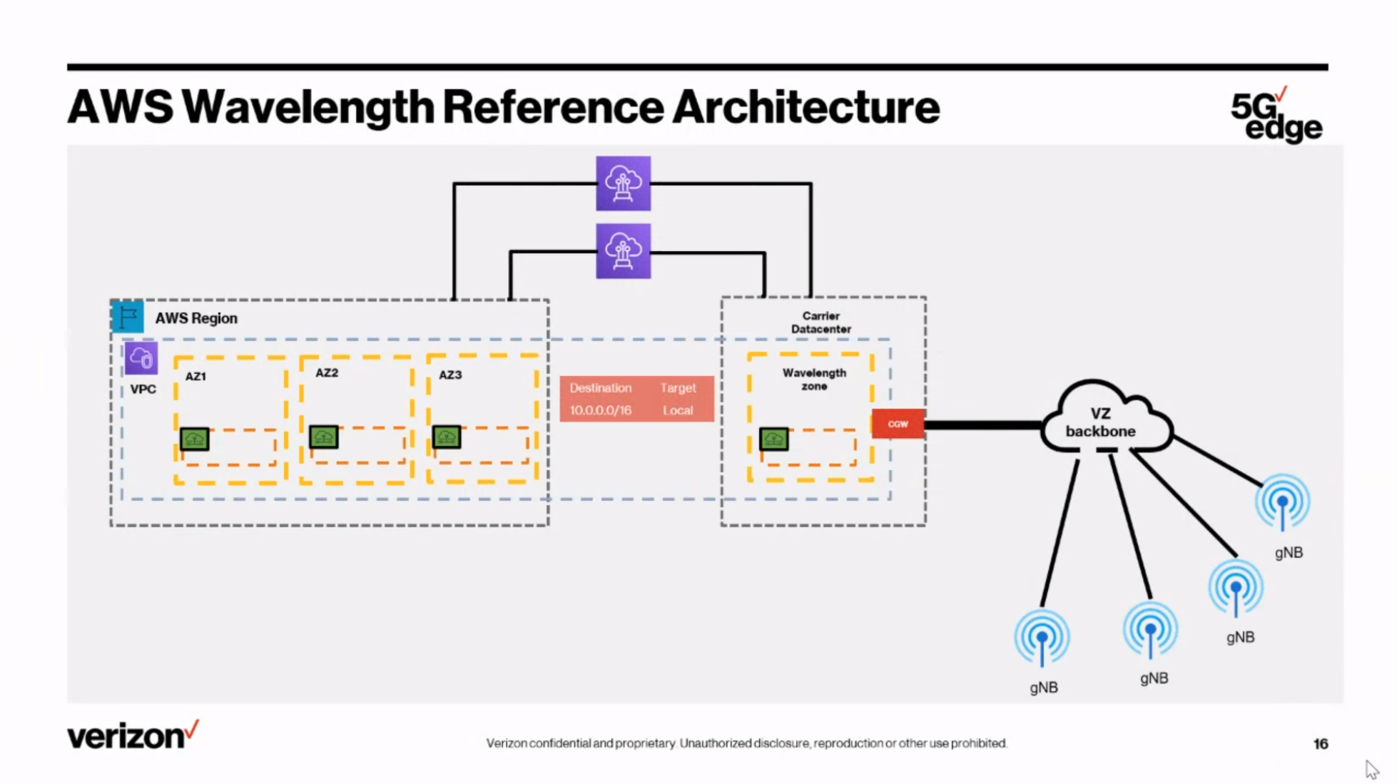 AWS Wavelength를 사용하면 개발자가 모바일 디바이스 및 최종 사용자 측에서 발생하는 지연 시간이 10밀리초 미만인 애플리케이션을 제작할 수 있다. AWS 개발자는 이동 통신 사업자 데이터 센터 내의 5G 네트워크 엣지에 AWS 컴퓨팅 및 스토리지 서비스를 포함하는 AWS 인프라 배포 환경인 Wavelength Zone에 애플리케이션을 배포하고 해당 리전의 다양한 AWS 서비스에 원활하게 액세스할 수 있다. 이를 통해 개발자는 게임 및 라이브 동영상 스트리밍, 엣지의 기계 학습 추론, 증강 및 가상 현실(AR/VR) 등 10밀리초 미만의 지연 시간이 요구되는 애플리케이션을 제공할 수 있다. AWS Wavelength는 5G 네트워크 엣지에 AWS 서비스를 제공하여 모바일 디바이스에서 애플리케이션에 연결할 때 발생하는 지연 시간을 최소화 한다. 애플리케이션 트래픽은 모바일 사업자 네트워크 내의 Wavelength Zone에서 실행되는 애플리케이션 서버로 전송될 수 있다. 이를 통해 지연 시간이 100밀리초를 초과하게 만들어 고객이 5G의 향상된 대역폭 및 지연 시간을 완전히 활용하지 못하게 할 수 있는 인터넷에 대한 추가적인 네트워크 홉이 줄어들게 된다. 아래 그림은 미국 버라이즌 통신사에 구축된 Wavelength 이다.