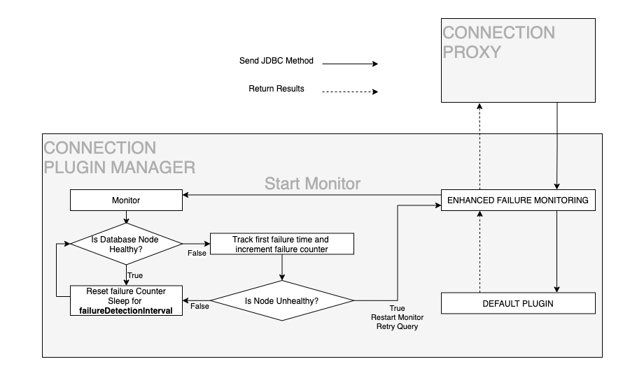 Enhanced Failure Monitoring은 모니터 스레드에 의해 구현된 연결 플러그인으로 MySQL용 AWS JDBC Driver를 향상된 장애 조치를 지원한다. 모니터는 연결된 데이터베이스 노드의 상태를 주기적으로 확인한다. 데이터베이스 노드가 비정상인 것으로 확인되면 새 데이터베이스 노드로 쿼리가 재시도되고 모니터가 다시 시작된다. 기본적으로 Enhanced Failure Monitoring 플러그인이 로드 된다. 그러나 Amazon RDS Proxy를 사용하는 경우에는 향상된 장애 조치가 필요하지 않으며 RDS Proxy드라이버가 처리한다.