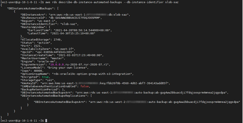 [ec2-user@ip-10-1-0-11 ~]$ aws rds describe-db-instance-automated-backups --db-instance-identifier slob-saz