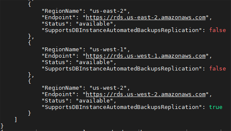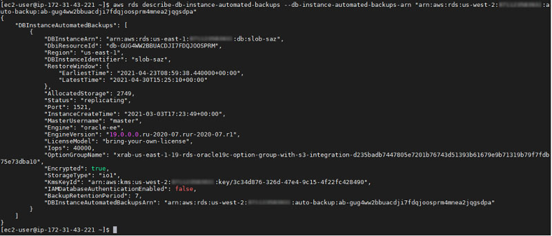 [ec2-user@ip-10-1-0-11 ~]$ aws rds describe-db-instance-automated-backups --db-instance-automated-backups-arn " arn:aws:rds:us-west-2:xxxxxxxxxxxx:auto-backup:ab-gug4ww2bbuacdji7fdqjoosprm4mnea2jqgsdpa"