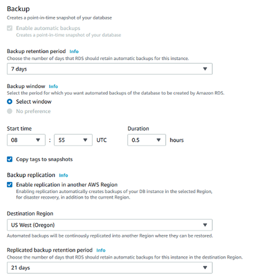 AWS Management Console 또는 AWS CLI 통해 교차 리전 자동 백업을 설정하는 것은 간단하다. 인스턴스를 생성할 또는 이미 생성된 인스턴스를 간단히 수정하여 교차 리전 자동 백업을 활성화 있다.