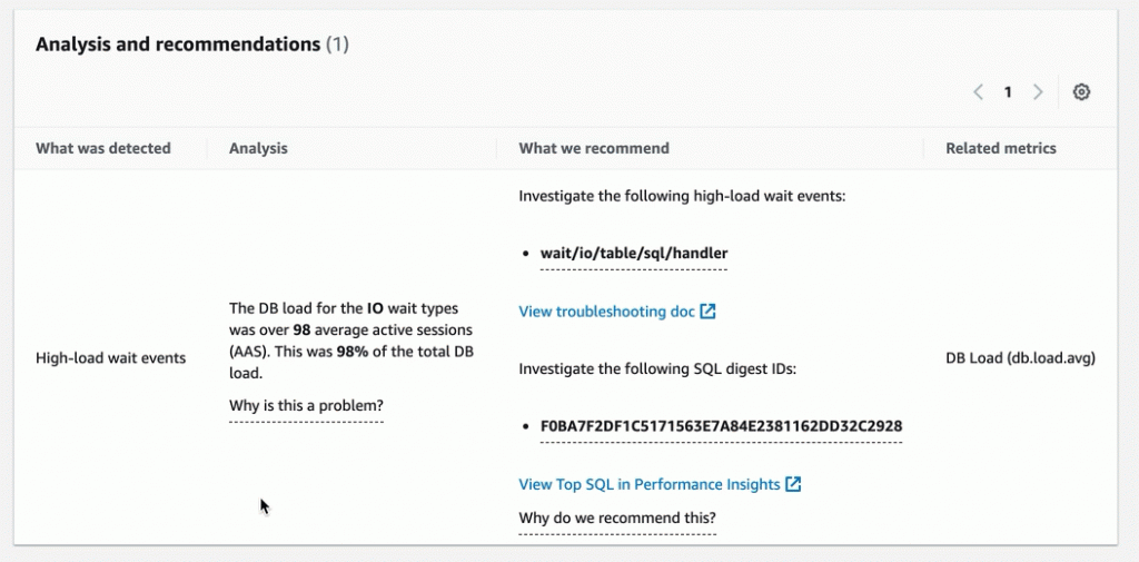 DevOps Guru for RDS 분석 페이지에서는 문제의 원인과 해결을 위한 몇 가지 권장 사항도 보여주는데 위 메트릭에서의 이상 징후는 높은 로드 대기 이벤트와 CPU 용량 초과라는 두 가지 문제가 감지되었다. 그리고 아래와 같은 분석결과는 나타내었다.
