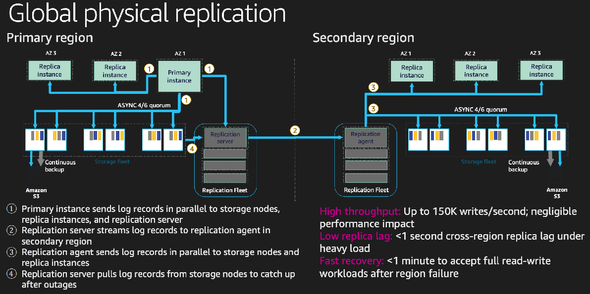 Aurora의 또 다른 특징은 교차 리전 복제(Cross Region Replication, CRR)이다. 각 리전당 3개의 가용 영역, 6개의 복제본이 제공된다. Write 작업은 Primary 인스턴스에서 수행되고 로그 레코드가 Replica 인스턴스로 전달된다.