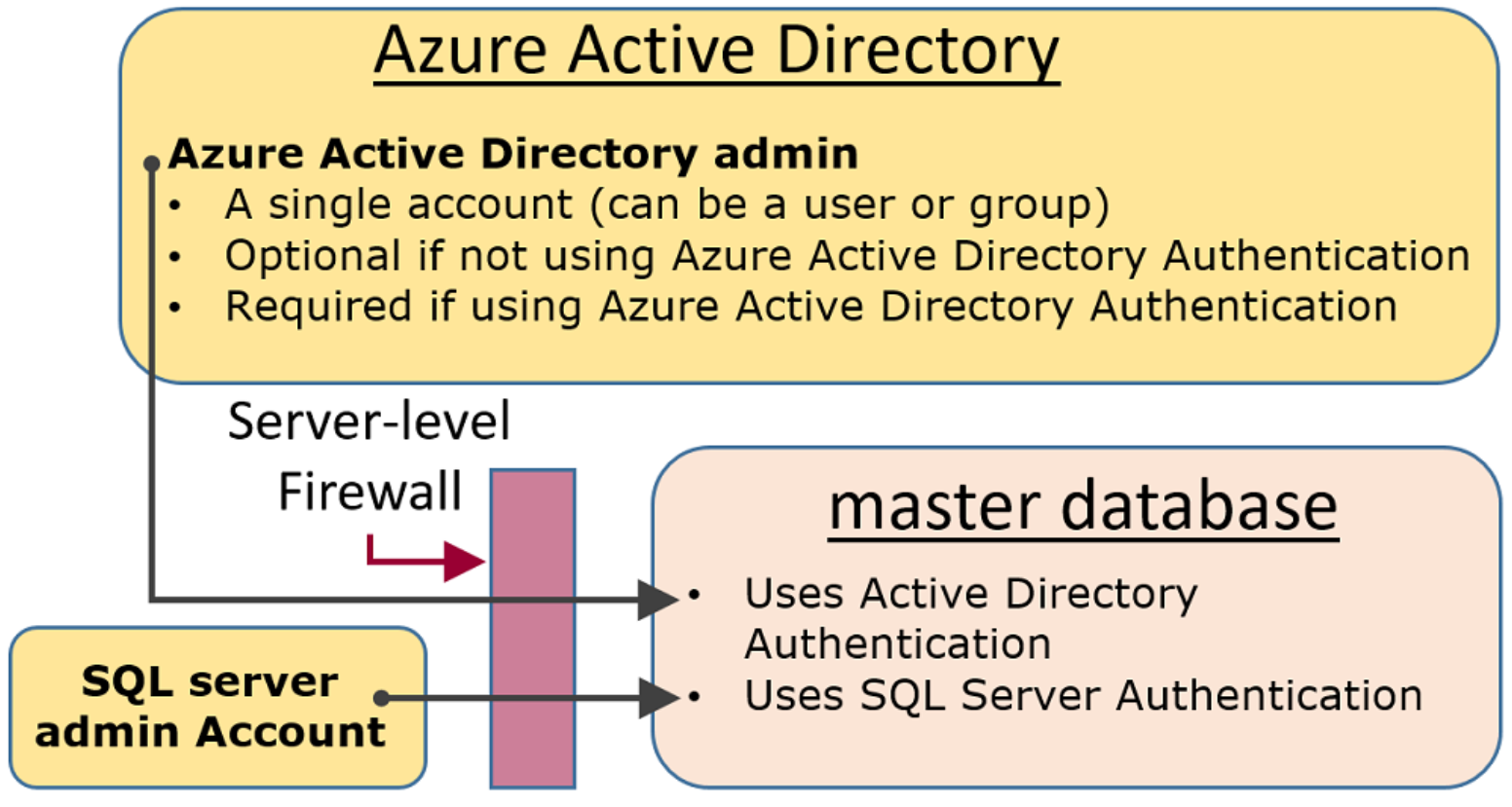 Server Admin login과 Azure Active Directory admin 관리자 계정에는 다음과 같은 특징이 있다.