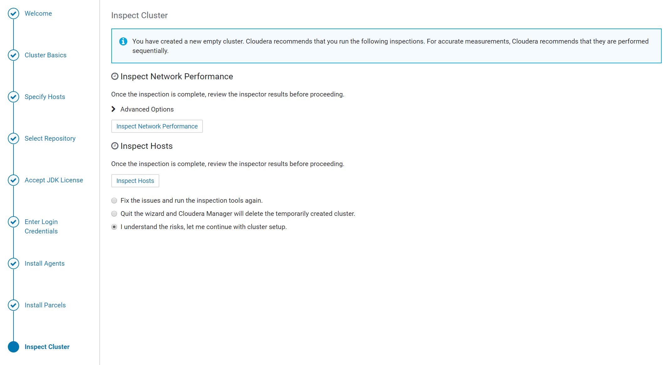 클러스터 세팅이 완료되었으면 Inspect 상태를 나타내는데, 마지막 항목을 클릭하여 마무리 한다.