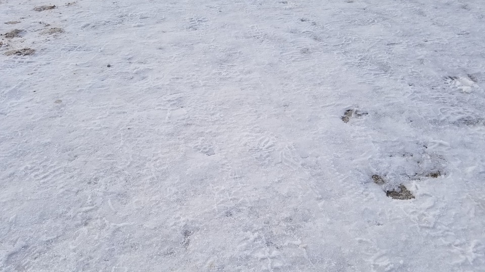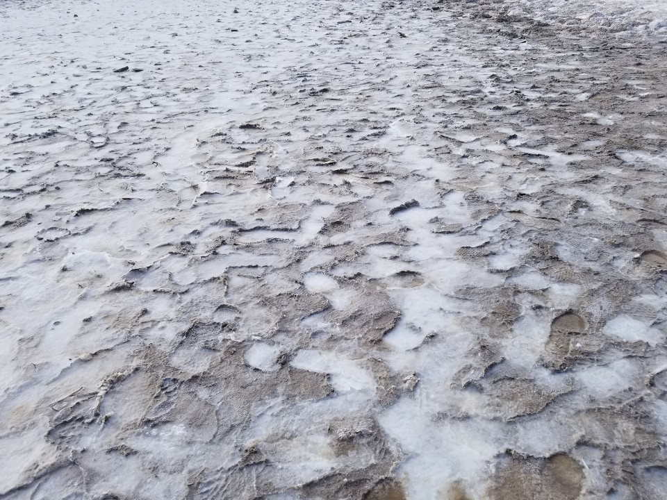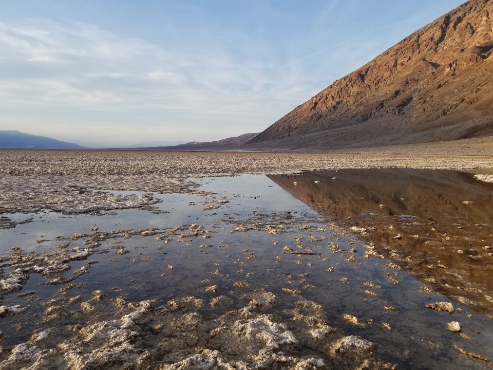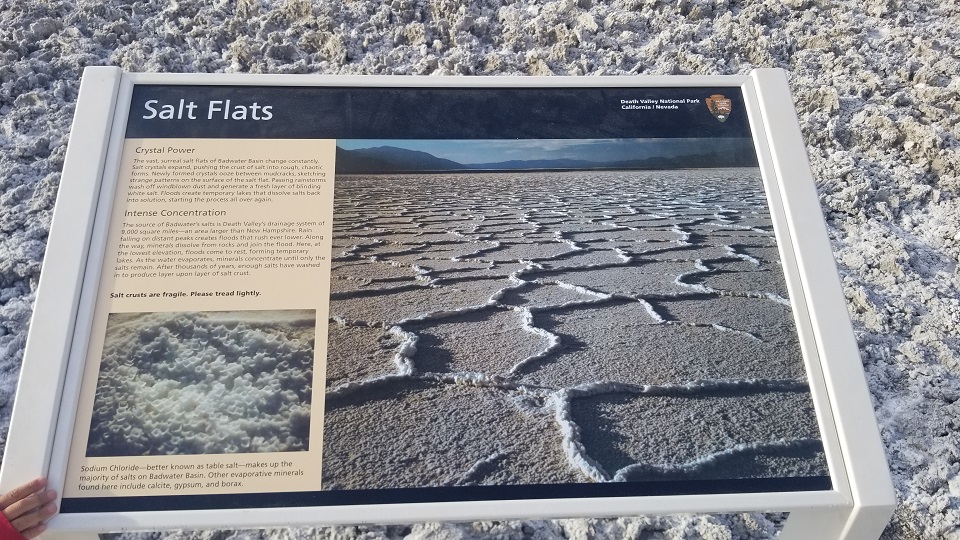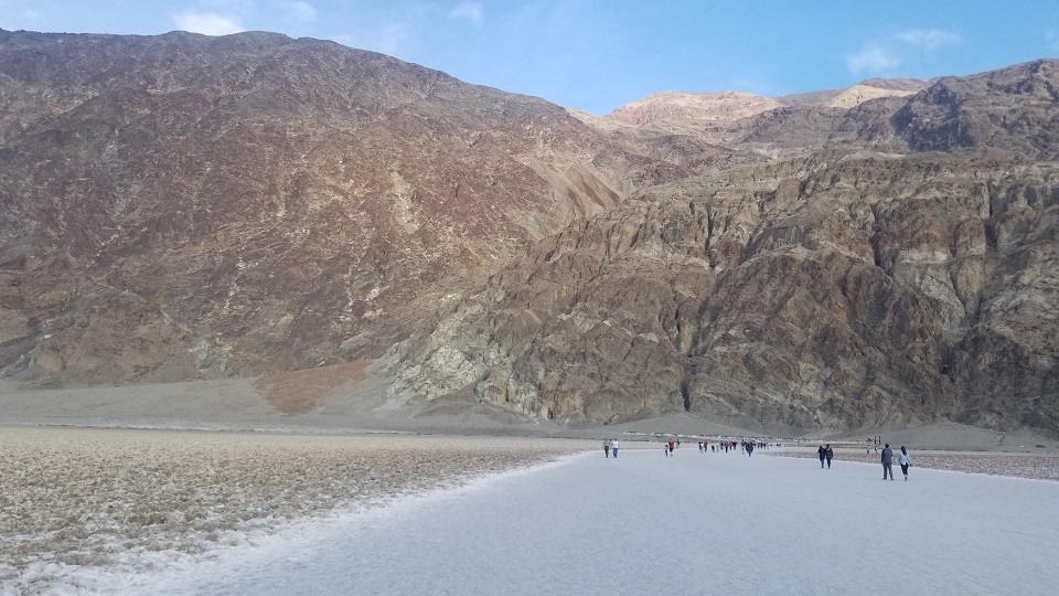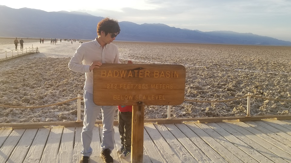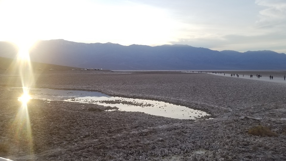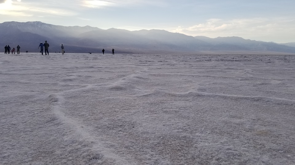 그 다음 이동한 곳이 데스밸리의 핵심인 Bad Water 이다. 이 곳은 해수면 보다 282피트 (85.5 미터) 낮은 육지로, 바다보다 낮기 때문에 바다물이 육지로 스며 올라와서 소금으로 뒤덮힌 땅을 만날 수 있다.