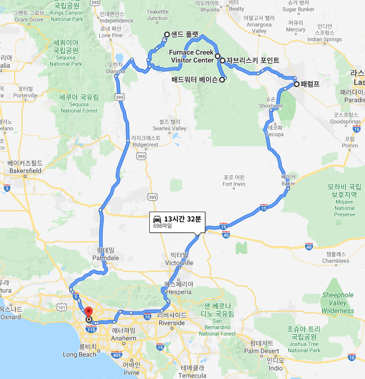이제 본격적으로 여행기를 적을 차례인데, 출발부터 복귀까지의 여정은 “LA -> 데스벨리 (Sand dunes, Bad water, Zabriskie point) -> 호텔(pahrump, Nevada) -> LA”로 약 700마일의 루트였으며, 너무 무리하지 않는 선에서 여행일정을 정하였다. (1마일은 약 1.6킬로미터)