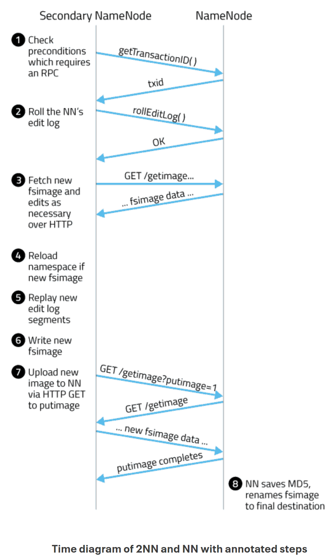 5. 주 네임노드는 이전 fsimage를 보조 네임노드로부터 받은 새로운 이미지로 교체하며, 이전 edits 파일을 1단계에서 시작한 새로운 edits로 교체한다. fsimage 파일도 체크포인트가 발생한 시간을 기록하기 위해 변경된다.
