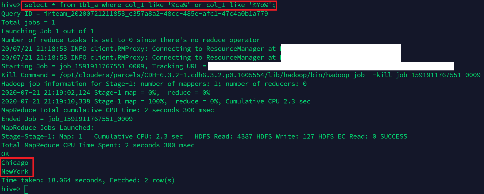 Hive에서 LIKE 구문은 RDBMS의 LIKE 구문과 동일한 동작으로, 어떤 서브 문자열(substring)이 문자열의 시작이나 끝, 혹은 문자열 내에서 일치하는지 확인할 수 있다.
