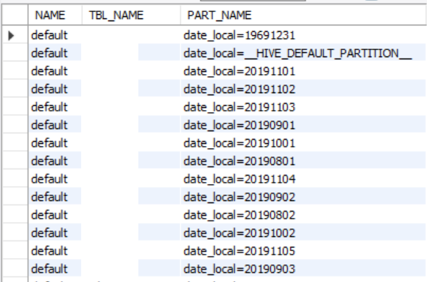 SELECT d.NAME, t.TBL_NAME, p.PART_NAME FROM hive.DBS as d inner join hive.TBLS as t on d.DB_ID = t.DB_ID inner join hive.PARTITIONS as p on t.TBL_ID = p.TBL_ID where t.TBL_NAME like '%key%'; |