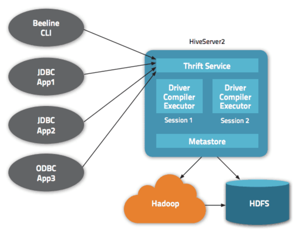 일반적으로 하이브 세션은 메타스토어로 이용하는 JDBC 데이터베이스에 직접 연결된다. 하이브는 쓰리프트 메타스토어(ThriftMetastore)라는 선택적 구성요소를 제공하는데, 이를 설치하면 하이브 클라이언트는 쓰리프트 메타스토어로 연결되고 쓰리프트 메타스토어가 JDBC 데이터베이스에 연결된다.