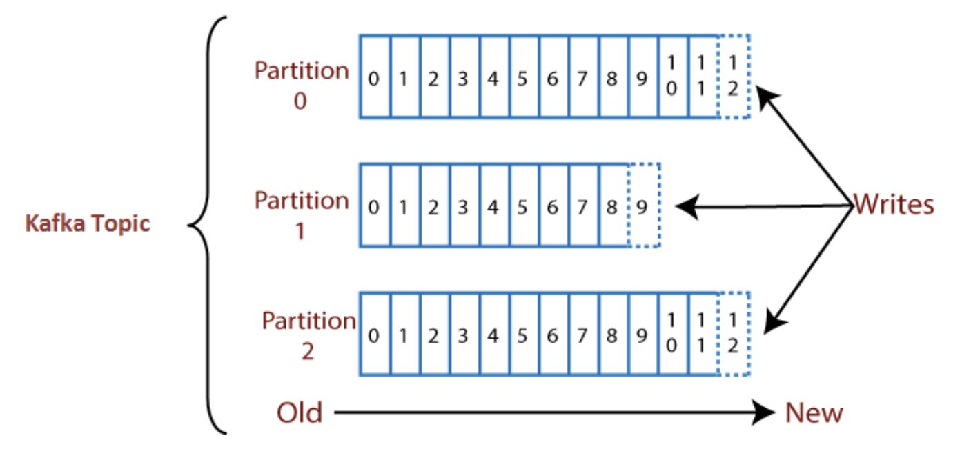 아래 그림을 보면 토픽에 대한 파티션이 3개가 있고, 메시지는 각 파티션별로 분산되어 저장된다. (그림에서 숫자는 오프셋 위치이다.)