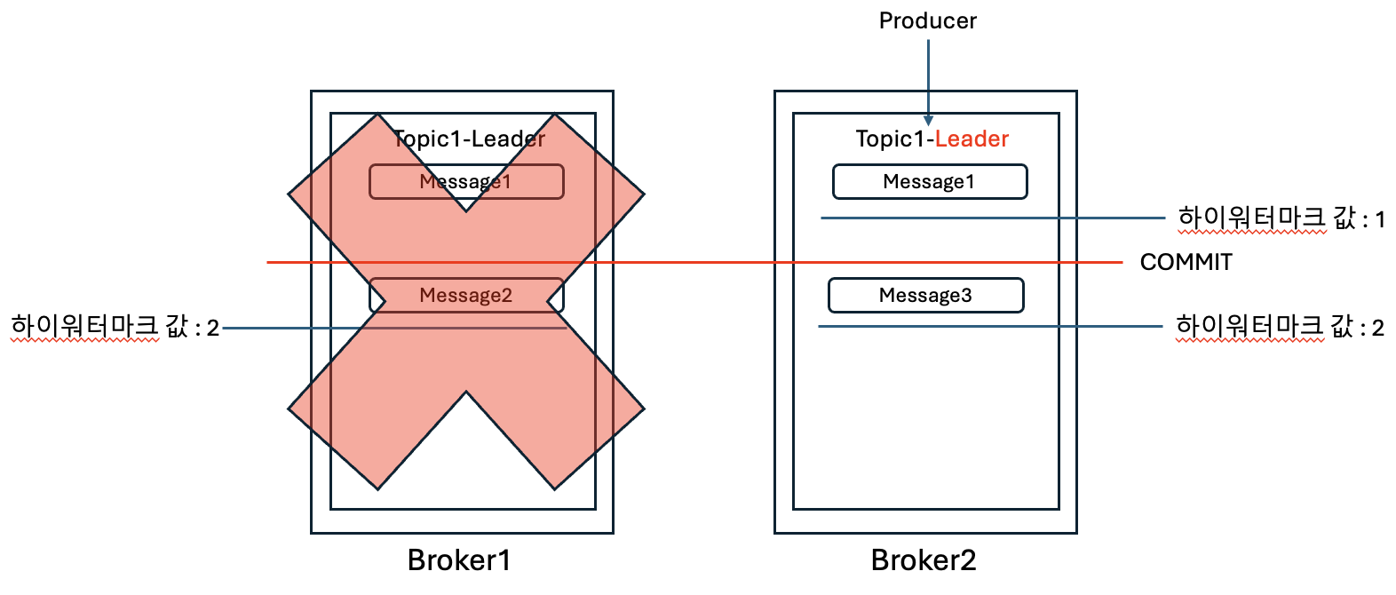 3. Message2가 팔로워로 복제되기 전에 현재 리더 역할을 하는 Broker1이 다운되었다.