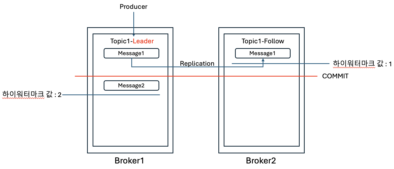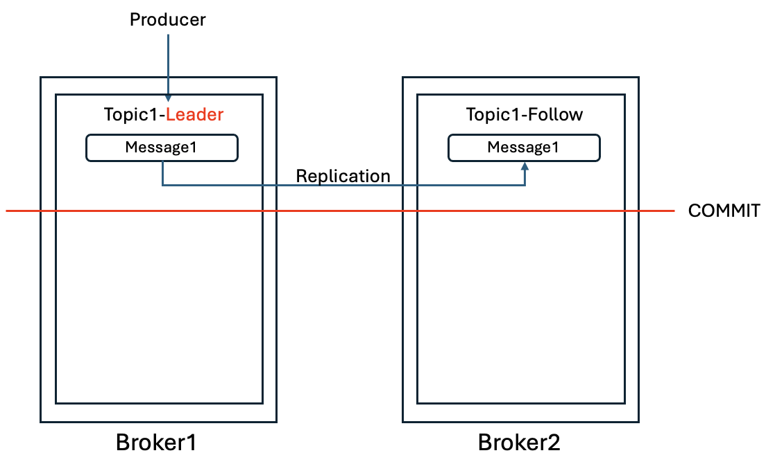 1. 프로듀서가 리더를 통해 Message1을 입력한다. 그리고 팔로워는 Message1에 대해서 복제를 완료한 상태이다.