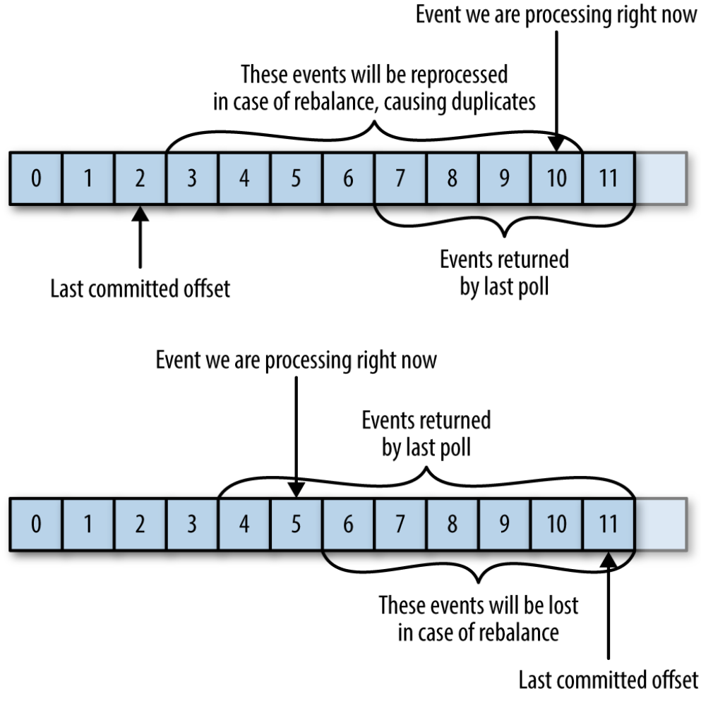 컨슈머 그룹의 컨슈머들은 각각의 파티션에 자신이 가져가 메시지의 위치 정보(오프셋)을 기록한다. 이렇게 현재의 위치를 업데이트 하는 동작을 커밋(commit) 이라고 한다. 컨슈머에 장애가 발생하거나 새로운 컨슈머가 추가되었을 때 리밸런싱이 발생하고, 컨슈머는 새로운 파티션에 대해 가장 최근 커밋된 오프셋을 읽고 그 이후부터 메시지들을 가져온다. 만약 커밋된 오프셋이 컨슈머가 실제 마지막으로 처리한 오프셋보다 작으면 메시지는 중복으로 처리되고, 커밋된 오프셋이 컨슈머가 실제 마지막으로 처리한 오프셋 보다 크다면 마지막으로 처리된 오프셋과 커밋된 오프셋 사이의 모든 메시지는 누락된다. 이러한 동작방식 때문에 커밋은 매우 중요하다.