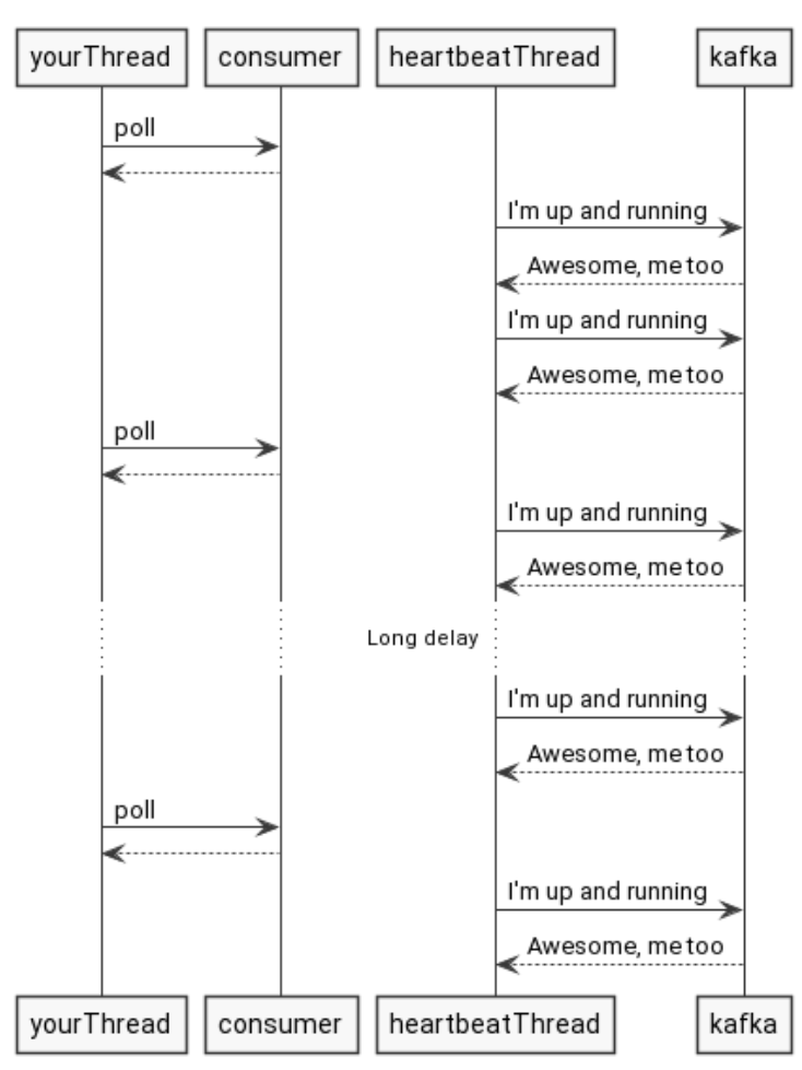 새로운 하트비트 방식 (KIP-62)에서는 백그라운드 스레드가 도입되어 사용자가 poll()을 호출하기를 기다리는 대신 이 스레드는 Kafka에 우리가 잘 작동하고 있음을 알리는 역할을 한다. 따라서 전체 프로세스가 하트비트 스레드와 함께 종료되면 Kafka는 이를 신속하게 발견하고 하트비트가 비동기식으로 더 자주 전송되기 때문에 레코드 처리에 소요되는 시간에 더 이상 영향을 받지 않는다.