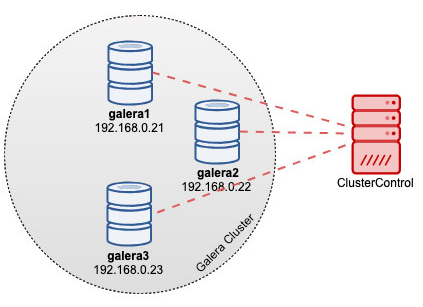아래 그림과 같이 ClusterControl에 의해 배포된 3노드 Galera Cluster가 구성되어 있다고 가정하고, 시나리오를 만족하기 위해 클러스터를 세팅하는 과정을 다루어 본다.
