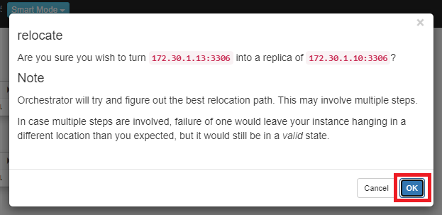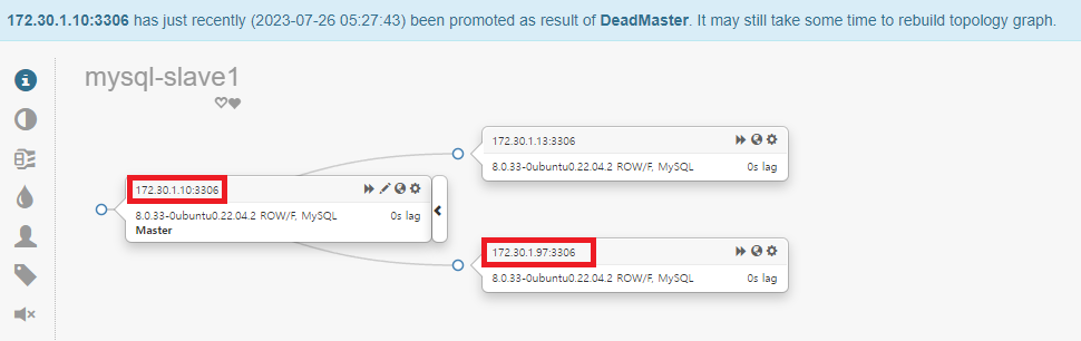 mysql-slave1(172.30.1.10)을 드래그 하여 mysql-master(172.30.1.97)로 드롭 한다. 이때 드롭하는 위치를 현재 마스터보다 조금 앞으로 위치하여 PROMOTE AS MASTER가 표시될 때 드롭 한다. (마스터 보다 뒤에 할 경우 relocate로 표시된다.)