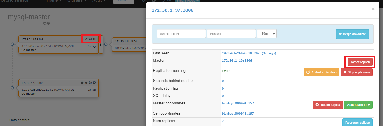 master-master 구조에서 master-salve로 원복하기 위해서는 mysql-master(172.30.1.97) 서버에서 설정 아이콘을 클릭한다. 팝업이 나타나면 Master 항목에서 [Reset replica]를 클릭한다.