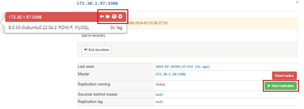 변경사항을 적용하였을 때, 대시보드 화면이 바로 갱신이 안되는 경우가 있다. 이때 새로고침을 하면 변경사항이 정상적으로 나타난다. 현재 구성되어 있는 토폴로지 상태를 보면, mysql-slave1(172.30.1.10) 서버가 master 역할을 하며, mysql-master(172.30.1.97)서버가 slave 역할을 하는 것으로 역할 체인지가 된 것을 확인할 수 있다. 하지만 mysql-master(172.30.1.97) 서버를 보면 역할 변경 후 새로운 마스터에 대한 복제 구성이 되지 않아서 오류로 표시되고 있다.