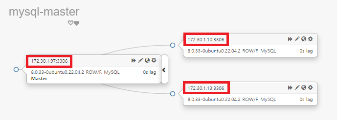시나리오를 처음 상태로 원상복구하려면 mysql-slave2(172.30.1.13)를 드래그하여 mysql-master(172.30.1.97)에 드롭 한다.