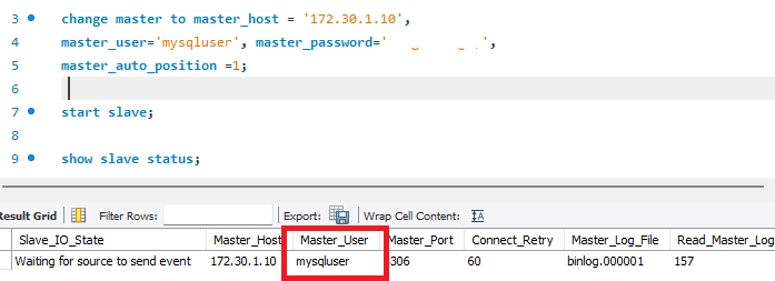 MySQL 서버가 정상적으로 실행되었으며 현재는 독립적으로 실행되고 있기 때문에, 기존의 복제 클러스터에 조인하기 위해서는 현재 master 역할로 운영중인 mysql-slave1(172.30.1.10) 서버로 복제를 연결한다.